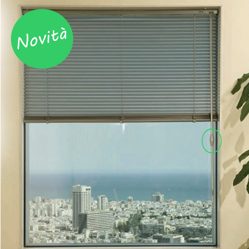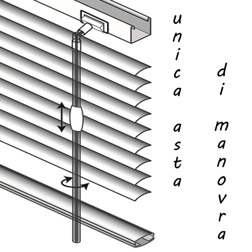 Ruotando la bacchetta, le lamelle in alluminio girano per modulare l’intensità della luce in entrata; facendo scorrere in alto o in basso la manopola presente sulla bacchetta si solleveranno le tende per interno da ambiente professionale all’altezza desiderata.